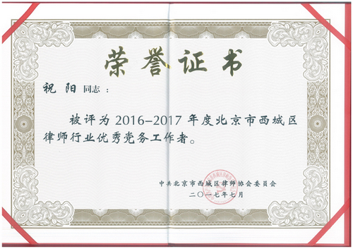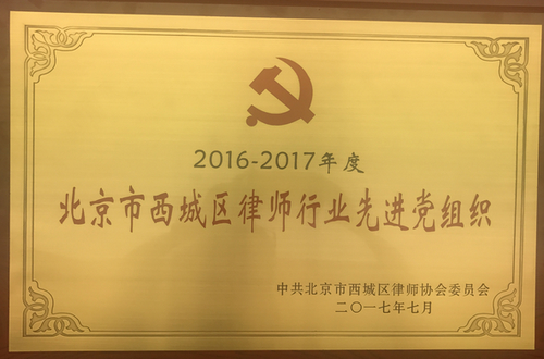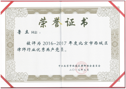 2017年6月28日,中共西城区律师协会委员会发出关于表彰“2016—2017年度西城区律师行业先进党组织、优秀共产党员和优秀党务工作者”的通报,本所党支部被评为2016-2017年度北京市西城区律师行业先进党组织、鲁立律师为2016-2017年度北京市西城区律师行业优秀共产党员、祝阳律师为2016-2017年度北京市西城区律师行业优秀党务工作者。