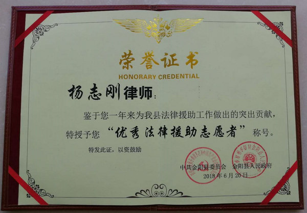 杨志刚律师在服务期内克服了诸多困难,顺利完成了援助任务,并赢得了中共金阳县委员会、金阳县人民政府颁发的“优秀法律援助志愿者” 荣誉证书。