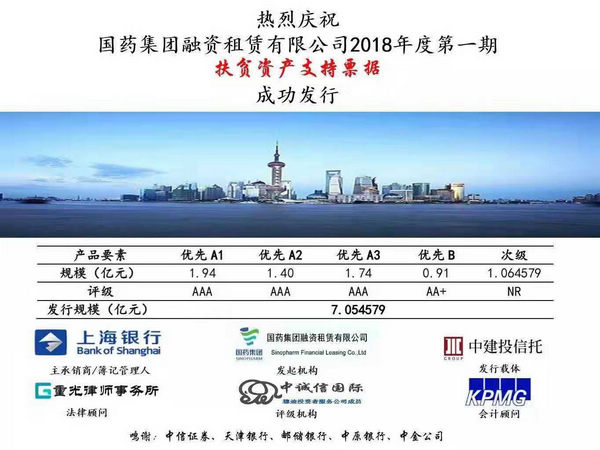 10月25日,银行间市场首单扶贫资产支持票据--国药集团融资租赁有限公司2018年度第一期扶贫资产支持票据(ABN)成功发行,本期发行金额为7.05亿元。