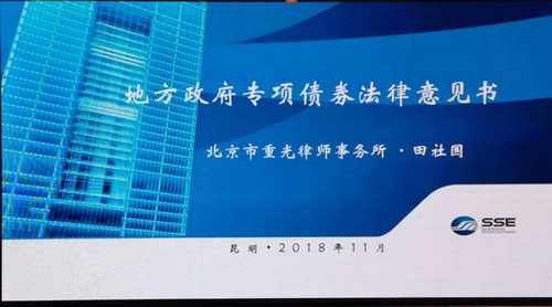 2018年11月6日,本所合伙人田社国律师在上海证券交易所组织的“地方政府专项债券发行实务培训班”(西南片区)上作为授课嘉宾,进行了“地方政府项目收益专项债券法律意见书实务”专题讲解。本次培训由上交所组织,证监会、上交所、云南省财政厅、重庆市财政局以及评级、会计师、律师相关专家进行了相关议题主讲,参会人员包括云南省各地市财政、重庆各地市财政系统负责人。