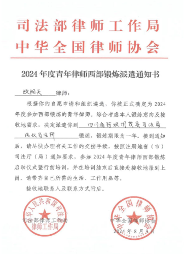 重光荣誉 | 青春逐梦西部,法治铸就辉煌 ——重光武汉分所欧阳天律师光荣入选司法部、全国律协西部锻炼青年律师