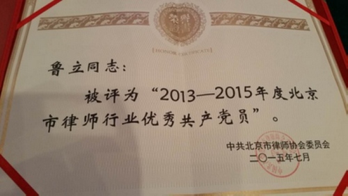 2015年7月1日,我所合伙人鲁立律师被中共北京市律师协会委员会评为“2013-2015年度北京市律师行业优秀共产党员”。