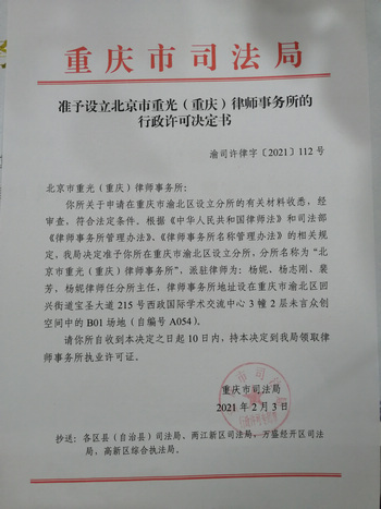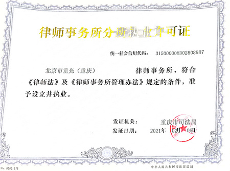 2021年2月8日,北京市重光(重庆)律师事务所经重庆市司法局批准设立并取得《律师事务所分所执业许可证》,标志着北京市重光律师事务所国内第2家分所——重庆分所正式成立。重庆分所将秉承“专业律所、智慧律所”的办所理念,借助中央大力推进成渝地区双城经济圈建设的政策东风,凭借独特的地理优势与卓越的专业能力,为各界客户提供更为优质、高效、便捷的法律服务,重光重庆分所与您共同成长、共创辉煌!